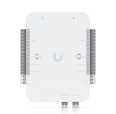 DC-powered hub that supports Wiegand and OSDP readers and provides entry and exit control for up to two doors.