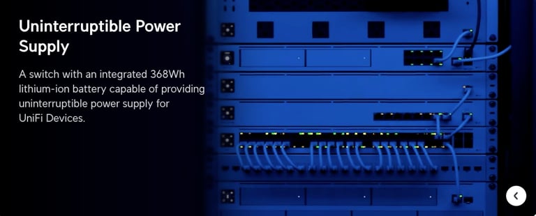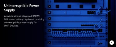 A switch with an integrated 368Wh lithium-ion battery capable of providing uninterruptible PoE to 8 devices..