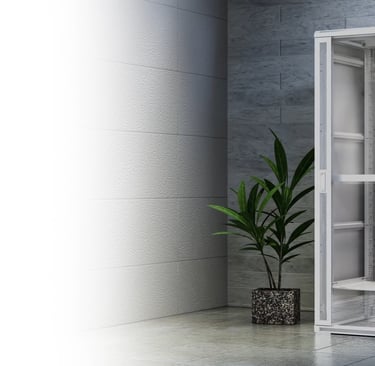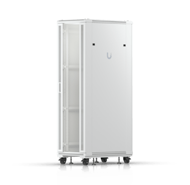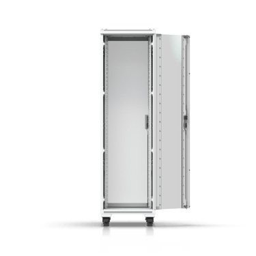 Fully assembled, floor-standing rack cabinet with glass front, ventilated rear, dual fans, and removable side panels.